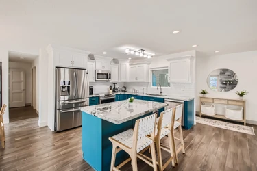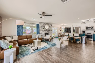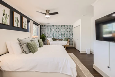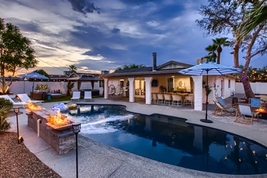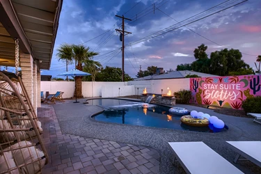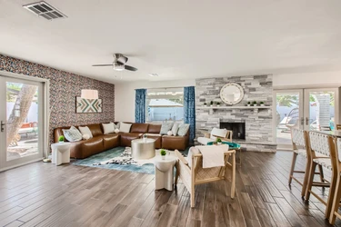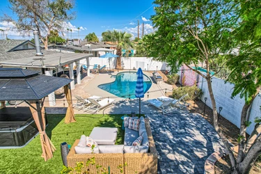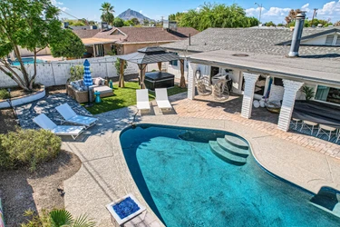The SuiteSpot is a beautiful four-bedroom, three-bathroom home in Scottsdale, AZ. Originally built in 1970, this gorgeous home has been fully remodeled to retain the charm of the past with all the modern features we expect. The home features a large open kitchen with a massive island, ample living space overlooking a sun-filled lawn, and plenty of upgrades like granite countertops and a fireplace. Outside, the home retains its original Scottsdale charm with a covered patio overlooking a heated pool.