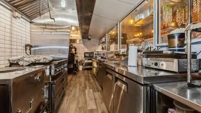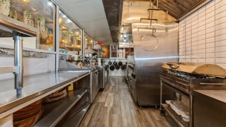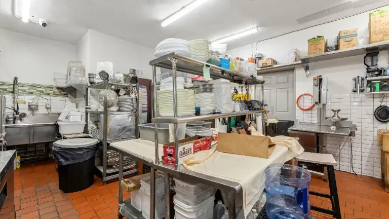 Behind the scenes, a spacious commercial kitchen stands ready for immediate use. Outfitted with professional-grade stainless-steel equipment, ample prep space, and thoughtful layout design, it allows for seamless workflow and efficient high-volume service. Every detail of the kitchen and service areas has been maintained with care and quality in mind.